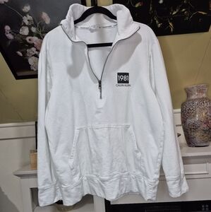 Classic white zip-up sweater by Calvin Klein. Features a half-zip design and front pocket. Ideal for casual wear.