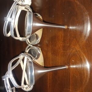 Chic Calvin Klein heels with a metallic finish. Strappy design for a modern look. Ideal for evening wear.
