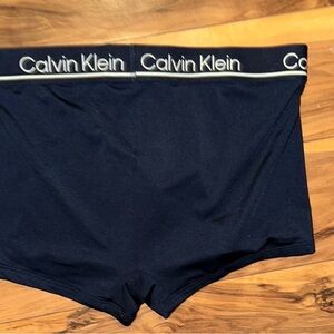 Sleek Calvin Klein briefs in dark blue. Features signature waistband. Contoured pouch. Extremely soft