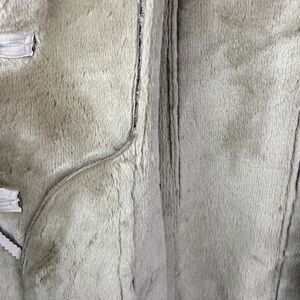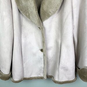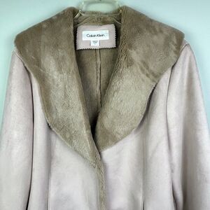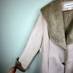 Calvin Klein beige microsuede button front faux fur coat. Cream faux shearling fur lining and trim, pockets, front double button closure, long sleeves. Perfect vintage Y2K style shorter length Penny Lane jacket! Collared, front pockets, fur trim at cuffs, peacoat silhouette. Very good used condition, very minor spots on coat on front, near button, and on sleeve shown in final 3 close up photos. Women's size L large, measurements pictured.