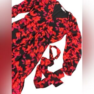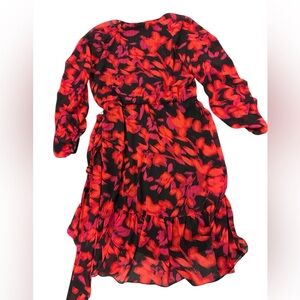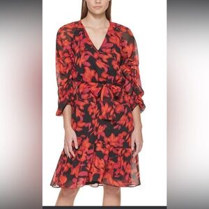 Calvin Klein beautiful midi dress with metallic stripes. Floral with gorgeous reds. Black lining. Excellent like new condition. Belted and ruffles. So flattering. Sleeves have ruching. Very nice.