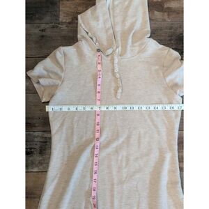 Elevate your casual style with this effortlessly chic Calvin Klein hooded t-shirt dress. The soft, heathered beige fabric is a comfortable blend of rayon, polyester, and spandex, offering a perfect, relaxed fit with great drape. The hood, short sleeves, and mini length give it an athleisure vibe, making it an intuitive choice for weekend wear or running errands. This dress is a feeling of simple, modern luxury that is incredibly easy to wear.