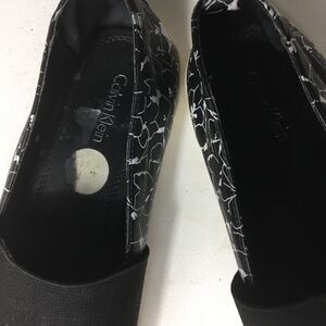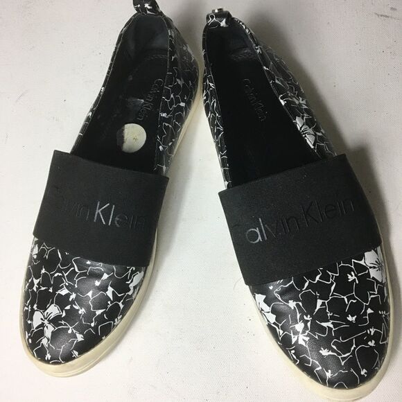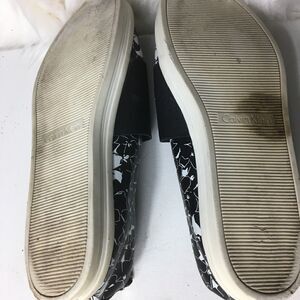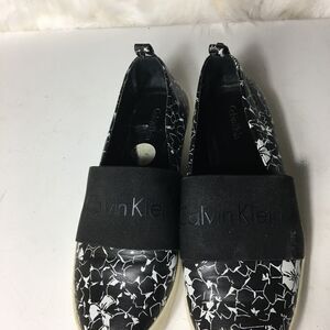 Calvin Klein Morina women’s black and white slip on sneakers size 9 pre owned in good used condition signs of wears in the bottom no tear .