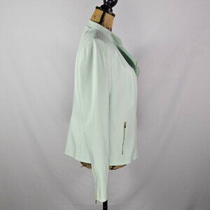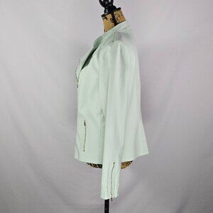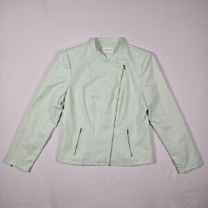 Fresh and polished Calvin Klein mint green moto jacket crafted from a lightweight, smooth-finish fabric — perfect for spring layering. Designed with an asymmetrical front zipper, gold-tone hardware, and a versatile silhouette that works with minimalist, pastel chic, and streetwear-inspired aesthetics. Size tag missing — please see measurements for best fit. Excellent pre-owned condition.