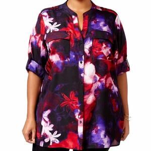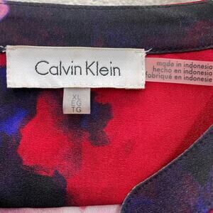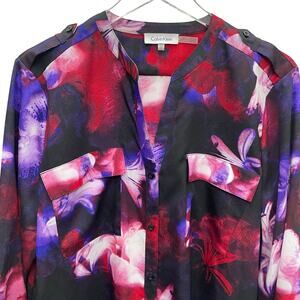 Calvin Klein Women's Multicolor Floral Split Neck Long Sleeve Blouse. Size XL. It features a vibrant floral pattern in shades of purple, pink, red and black, V-neckline, roll tab sleeves, and button-front closure. Shoulder epaulettes and front flap pockets. 100% polyester so virtually wrinkle-free. Excellent preowned condition.
