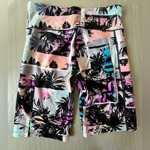 Vibrant bike shorts with a tropical print. Features a mix of colors for a bold look. Ideal for active wear. Fun pocket for phone or key!