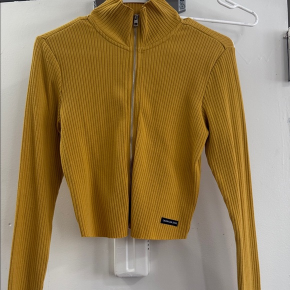 Stylish mustard ribbed jacket with a sleek front zipper. Perfect for any occasion.