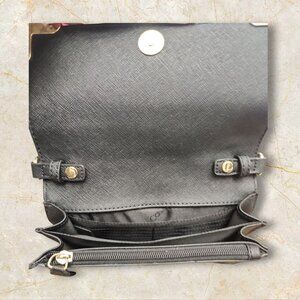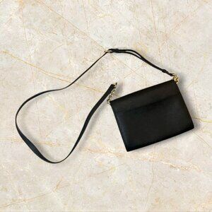 Calvin Klein Black Leather Saffiano Crossbody bag with a gold chain with an adjustable strap with one zipper pocket inside.