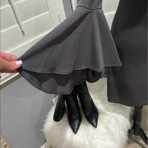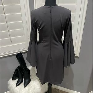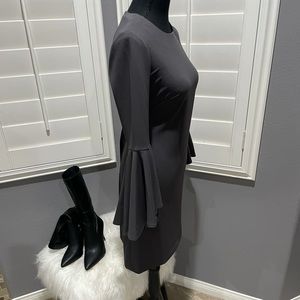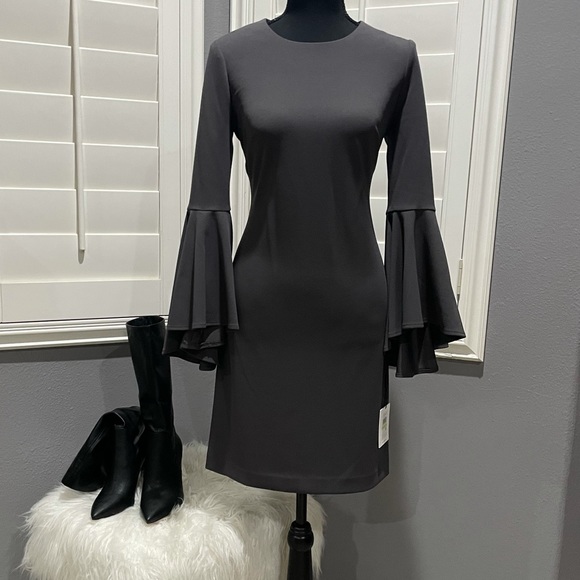 🤍 My all-time favorite color from Calvin Klein! NWT Gun metal gray, form fitted round neck dress with long exaggerated bell sleeves. Love this!!!