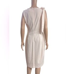 Stunning dress in the palest of pink color from Calvin Klein, new with tags. A pretty long line dress with a hidden back zip closure she has a bow draped across one shoulder, a tapered look waist and a ten inch slit in bottom for easy walking. Absolutely beautiful dress. Size 10! She has some stretch as well. Fully lined.