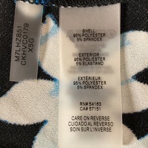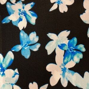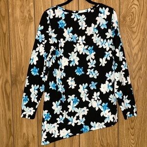 New With Tags. Pretty long sleeve pullover top with blue and white floral design on a black background. Scoop neckline. Asymmetrical hemline. Stretchy 95% polyester 5% spandex fabric.