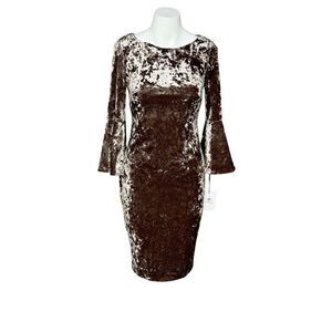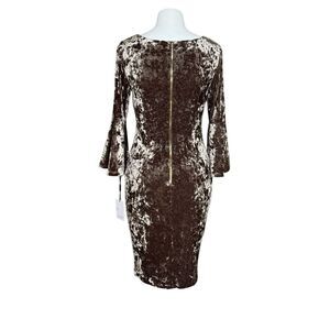 Calvin Klein NWT taupe brown crushed velvet bell sleeve sheath dress size 2. Style CD7V233E. Back zipper. 91% polyester 9% spandex. Length 38” Chest 15”.