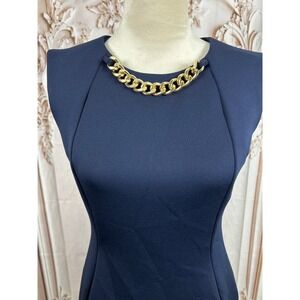 Keywords: Calvin Klein dress, navy blue dress, sheath dress, sleeveless dress, gold chain dress, cocktail dress, business dress, work dress, party dress, formal dress, classic dress, fitted dress, size 4 dress