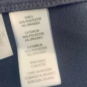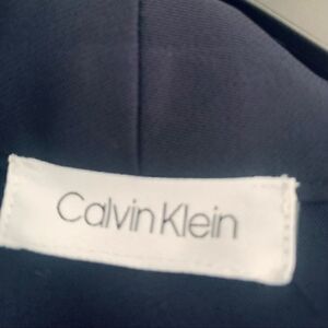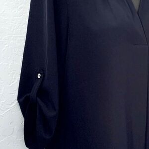 Pretty navy blue pullover blouse. V-neck. 3/4 length sleeves with buttons. Rounded hemline. Size tag has been removed. Please see measurements for sizing. Polyester/spandex fabric. In great used condition. Calvin Klein Size Medium/large