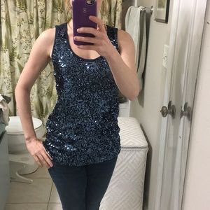 Very sassy sequined tank by Calvin Klein. Hits at hip. Scoop neck. Jersey knit style lining and back. Very comfortable. Excellent condition. Navy color. Size XS Petite.