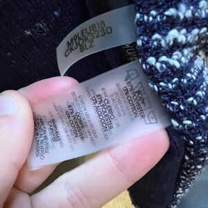 Calvin Klein navy and white moto inspired tweed blazer with zipper front pockets, inner lining, waterfall/open style front.