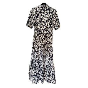Chic floral button bodice dress with tiered skirt and tie belt. Navy and white design.
