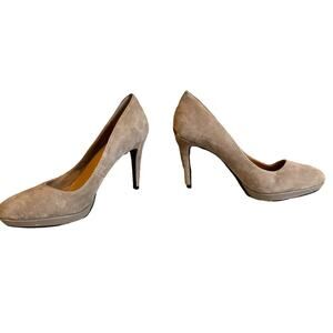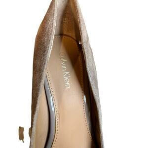 Calvin Klein Paulette Nude Suede pumps, size 8. Very good preowned condition, no signs of wear. Stiletto heel with gold logo at back, minor platform (1/4”). 1 tiny dark spot noted on back of heel - see photo, non slip sole