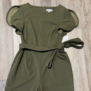 Beautiful olive green pants jumpsuit. Brand new with tags. Tie waist. Zipper closure in back.