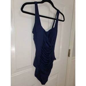 One piece Navy Blue Swimsuit that is gathering to make tummy look slimmer.
