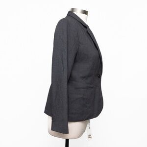 Calvin Klein. One-Button Blazer. Color: Charcoal Size: 12 Petite Brand new with tags, in new condition, but I needs a good pressing. Polished and professional, this Calvin Klein blazer is a wardrobe staple with a modern edge. Featuring a sleek single-button closure, subtle shoulder padding, and two besom pockets, it’s a timeless piece that pulls any look together. Fully lined for a smooth fit, with a silver button detail for a touch of sophistication. Approximate lay-flat measurements in inches: Hips: 23" Waist: 18" Underarm to underarm: 19" Length from top shoulder: 24"