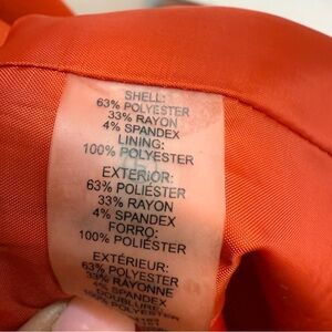 This Calvin Klein blazer in a striking orange hue features a classic notched lapel and a tailored fit, making it a standout piece for any professional setting. Its structured fabric and modern cut ensure a sleek and polished appearance.