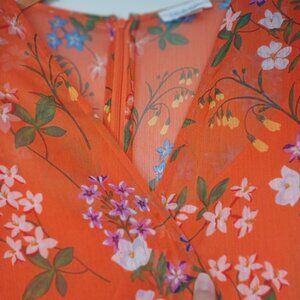 Chic high low dress with floral pattern. Vibrant orange base. Perfect for stylish outings.