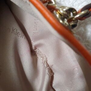 This stylish orange leather bag features a chic chain strap and a secure lock closure. Perfect for adding a pop of color to any outfit.