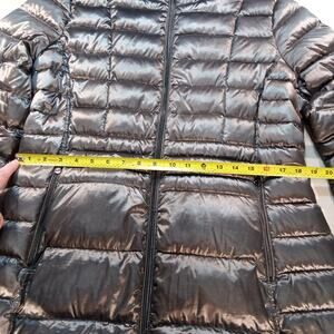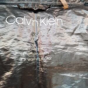 Stay warm in style with this Calvin Klein Packable Premium Down Coat in metallic charcoal. Features include a full front zipper, hood, lightweight quilted design, and an adjustable waist for a flattering fit. Insulated for warmth to 7°F, perfect for winter or travel. Made from durable nylon with premium down fill for comfort and easy packing. Measures approximately 33" long and 18.5" across the chest. Excellent pre-owned condition with no major flaws, stains, or damage.