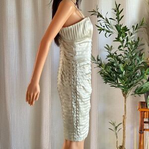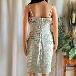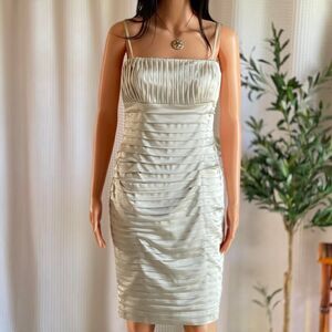 Sleek, sultry, and undeniably sophisticated—this Calvin Klein cocktail dress serves major old-Hollywood energy with a modern edge. Done in a pale champagne satin with allover horizontal pleating and a flattering bandage-style silhouette, this piece is made to turn heads at every angle.