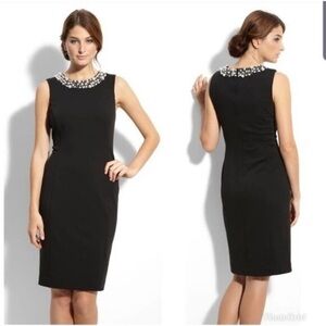 Elegant and timeless, this black Calvin Klein sheath dress is perfect for any special occasion. Sleeveless with a flattering tailored fit, this dress features a pearl-embellished neckline for a sophisticated, built-in accessory look. It zips in the back and is fully lined for comfort and structure. A classic piece that transitions effortlessly from cocktail events to formal gatherings.