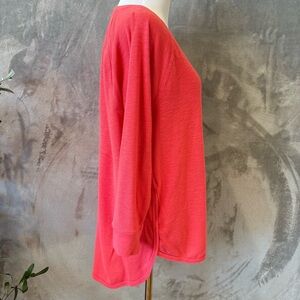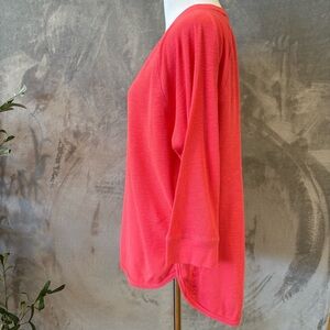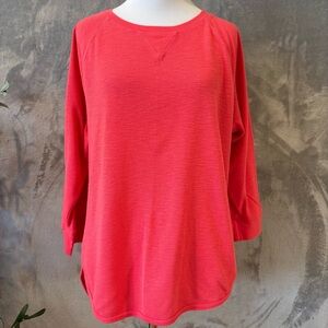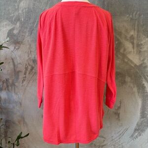 This Calvin Klein Performance top features a vibrant coral pink and a relaxed, boxy fit. Designed with 3/4 sleeves, it offers a comfortable and stylish option for casual wear.