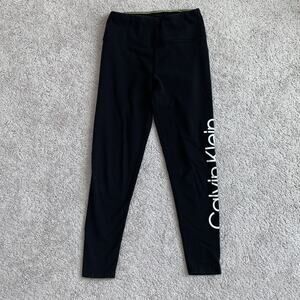 Pre-owned - Calvin Klein Performance black stretch active leggings. Black leggings with the white Calvin Klein logo up the left leg. Wide waist band with small key pocket in waistband. Great for yoga and working out. Size small