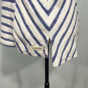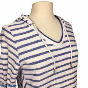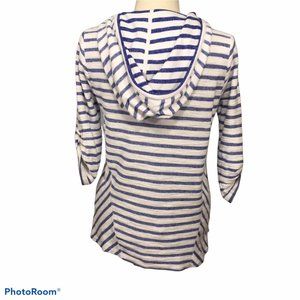 This stripe v-neck hooded pullover features drawstring hoodie, button on arm for securing rolled sleeves, and quick dry material great for after the pool or beach or a hard workout at the gym. Loose fitted cut with small side slits and denim blue stripe color.