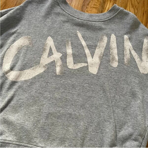 Gray crewneck sweatshirt with *Calvin* “painted” design across the chest.