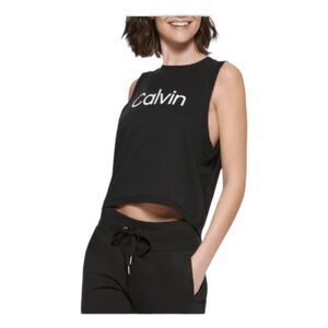 Calvin Klein Performance Logo Graphic Muscle Tee in Black with White Logo Lettering. It is Sleeveless, has a Crewneck, Ribbed Knit Collar, Cuffs and Hem and is a Cropped Pull-Over style. Great for running, working out, yoga, the gym, running errand or just lounging around. It would make a great Christmas Hanukkah Valentine’s Day Birthday or any Holiday gift!