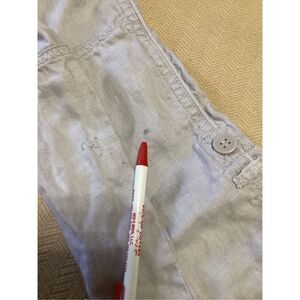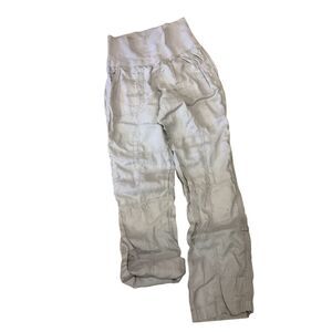 Good Preowned Condition, light spots on leg see pic 4, light weight fast dry cool linen, lots of pockets, light grey color, very wide fold down waistband, legs can be rolled up to capris length with attached tabs see pic 2, tagged size S, but please See Measurements for Custom Fit.