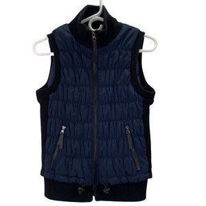 Calvin Klein Performance puffer vest in blue with black rib knit trim. Full zip, toggle cinchers at the bottom, zippered pockets, logo tag on side. Good condition. Size XS.