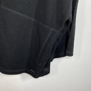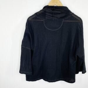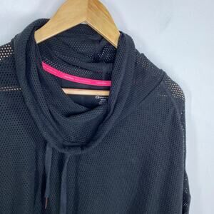 Stretch black cowl neck pullover. Long sleeves, pullover styling, drawstring cowl neck. Breathable mesh style.