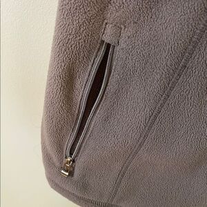 Cozy taupe fleece vest with zip closure. Features a stylish collar and side pockets inside pocket headphone access