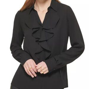 Ruffled detailing adds feminine finesse to this button-down blouse from Calvin Klein.