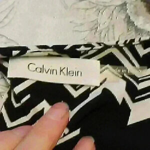 Classic black and white patterned pleated sleeveless knit top with keyhole back neck closure by Calvin Klein.