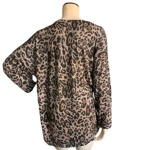 Chic Contemporary Relaxed Styling in this Dolman Sleeve Drop Shoulder Sheer Stretch Blouse. Leopard Pattern, 4 Gold Buttons at each Shoulder, Gold Logo Tag at Front Hem, Extra Button Envelope, and Satin Logo Hangar Loops inside shoulder seams.