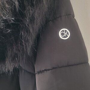 Mint condition. Gorgeous & warm Calvin Klein puffer winter coat w/ an attached bib detail. faux fur trim on (detachable) hood. WARM w polyester fill. Silver zippers. Unique inner zip sewn/partial vest. You can Zip up inner bib “vest” & keep your chest warm, leave main jacket unzipped. Look closely at photos. The fur hood is adorable but optional faux fur is removable.