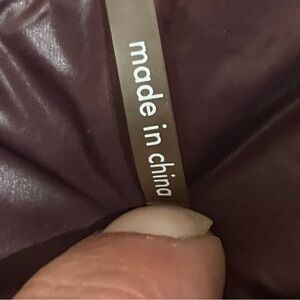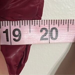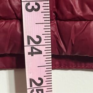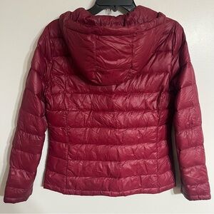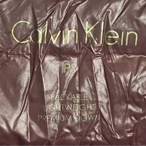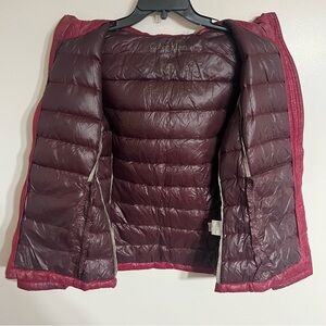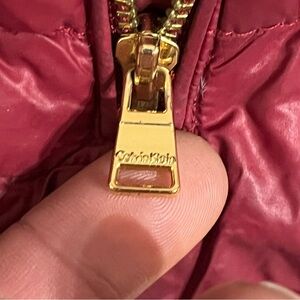 Women’s Calvin Klein lightweight Packable premium down jacket coat in a dark red wine color with gold hardware