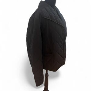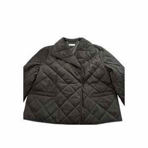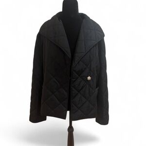 In excellent use condition. Coat has been cleaned. Slight faint patina on collar. Quilted peacoat design with one button close and 2 side pockets. Wear closed or open this is a fashionable Fall/ Winter coat to wear over a sweater, running to the store or going out to dinner.