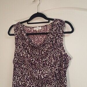 Sleeveless drape neck stretch blouse in purple, black, and white abstract spot/leopard pattern by Calvin Klein. size XL