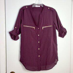 Calvin Klein purple tunic top with gold hardware accents, roll tab sleeves, front zipper pockets, button front, shoulder epaulets, and side tabs at the hemline. Perfect blouse to wear with leggings or skinny pants.