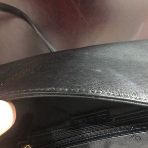 Black purse with magnetic closure . Inside zipper on one side and pockets on the other. Carrying strap included.