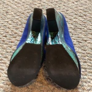 Gorgeous peep toe electric blue platforms with python looking bottoms. These are a true statement shoe. Only worn twice. In fabulous condition with very little wear. Heel is 4.5” and platform is 1.25”